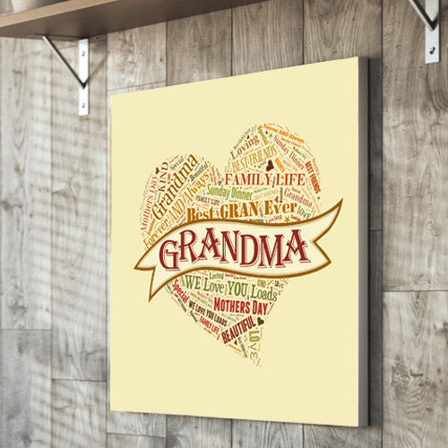 Create your own unique piece of artwork with your own special words of love for your Mother, Grandma or any other special person in your life.Simply provide your own words, and the person you would like to dedicate the canvas to.Our Studio team will create a text art heart montage. This creates a beautiful piece of artwork which is a wonderful gift for Mother's Day and the whole year through.